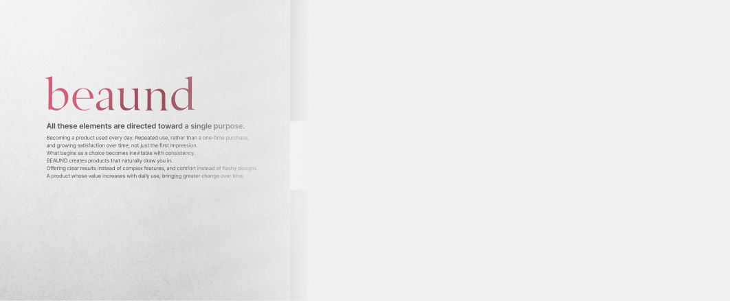 The first time may be a choice, but continued use is inevitable. BEAUND creates products that you’ll reach for naturally. We offer definite results instead of complicated functions, comfort instead of flashy designs. Products whose value increases with daily use, that bring bigger changes over time.